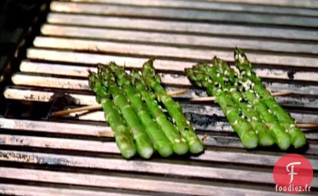 Préchauffer le gril à haute température. Enlevez les bases ligneuses des asperges et jetez-les. Embrochez 4 ou 5 lances d'asperges ensemble, en utilisant les cure-dents ou 2 brochettes de bambou, en formant une forme de radeau.