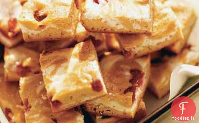 Saupoudrer de framboises. Déposer le reste de la pâte par cuillères à soupe sur les framboises. Mélanger la pâte, le mélange de fromage à la crème et les framboises avec un couteau.