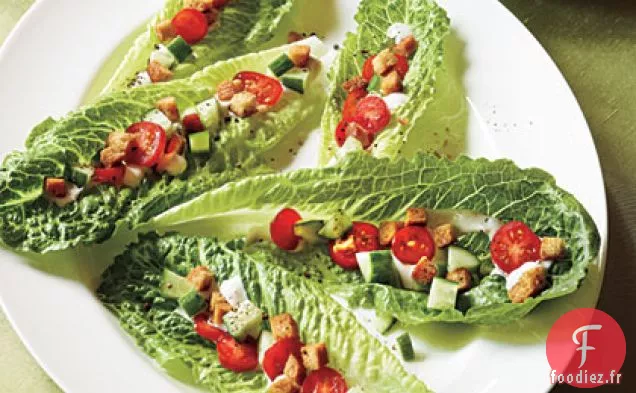 Séparez les cœurs de romaine en 24 feuilles moyennes et disposez-les sur un grand plateau. Déposer légèrement la vinaigrette au centre de chaque feuille. Garnir de concombre haché et des 3 ingrédients suivants.