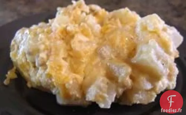 Dans un grand bol, mélanger les pommes de terre hachées surgelées, l'oignon, le fromage cheddar, la crème sure et le sel. Dans un petit bol, mélanger les soupes de poulet et de champignons.
