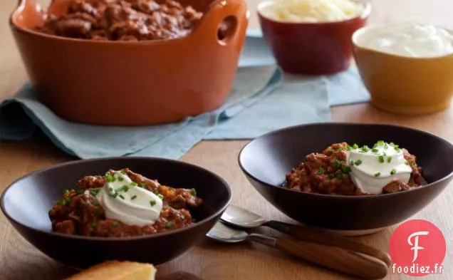 Dans une grande casserole, chauffer l'huile d'olive. Salez et poivrez l'épaule de bœuf, ajoutez-la à la casserole et faites-la dorer. Au fur et à mesure qu'il brunit, incorporer la poudre de piment, la coriandre, le cumin, le paprika, l'origan et la cannelle. Abaissez la température sous la viande pour "griller" les épices. Dans un robot culinaire, réduisez en purée les oignons, l'ail, les piments chipotle, le jalapeno, la pâte de tomate et le sucre et ajoutez-les dans la casserole. Augmenter le feu à moyen pour cuire un peu les légumes à la vapeur et sucrer les poivrons.