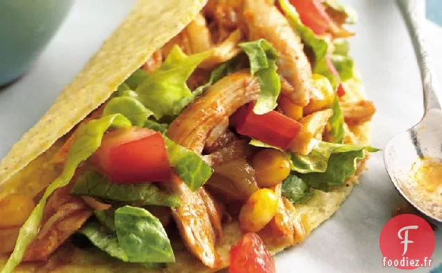 Servir le mélange de poulet dans des coquilles de tacos avec de la laitue, des tomates et de la sauce enchilada tiède.