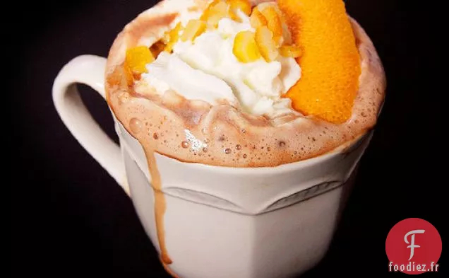 Ajouter le Grand Marnier et le pisco ou le rhum. Diviser en quatre tasses de service. Frotter le rebord de chaque tasse avec le zeste d'orange. Garnir de crème fouettée, d'écorce d'orange confite et de zeste d'orange.
