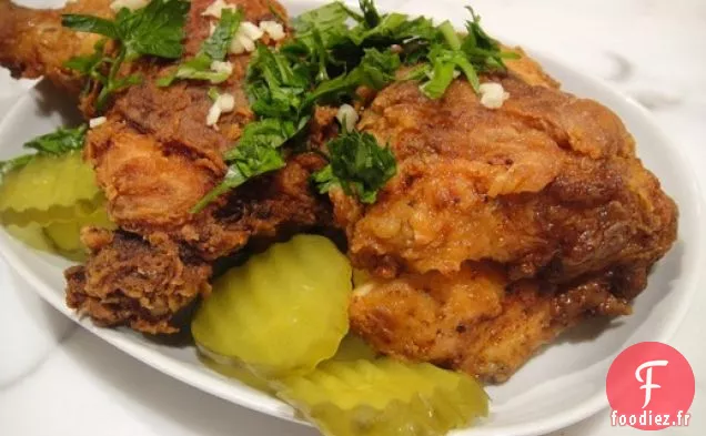 Égoutter le poulet sur une grille pendant 10 minutes, puis servir chaud, garni des cornichons et d'un confettis d'ail et de persil.