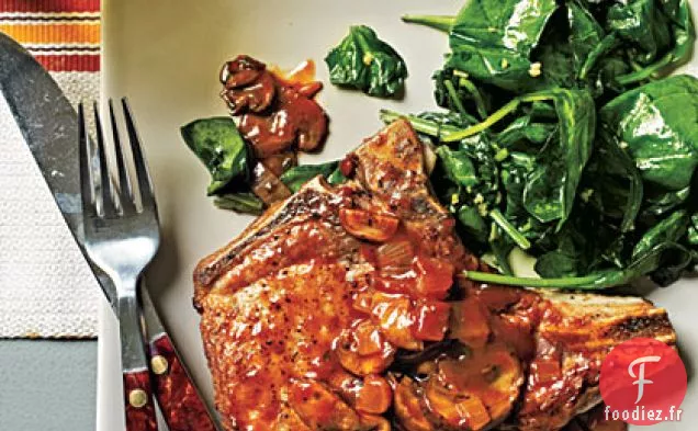 Ajouter les côtelettes de porc dans la poêle et cuire 3 minutes de chaque côté.