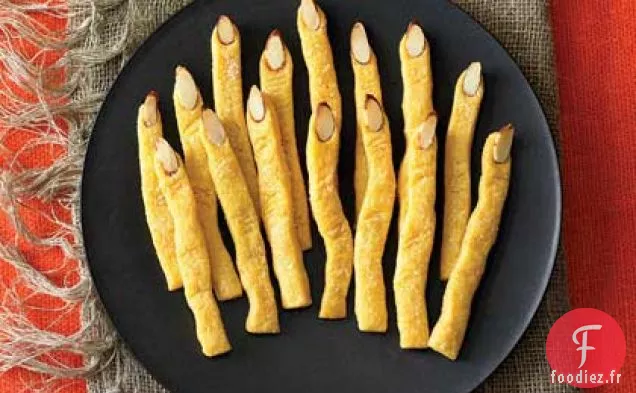 Saupoudrez de sel au goût, puis utilisez vos doigts pour arrondir le haut de chaque bande en forme de bout du doigt. Utilisez un couteau tranchant pour marquer des lignes de "jointure" peu profondes dans chaque doigt, puis appuyez sur un "clou" en amande dans la pointe. Si vous le souhaitez, pliez chaque doigt par endroits pour le rendre noueux.