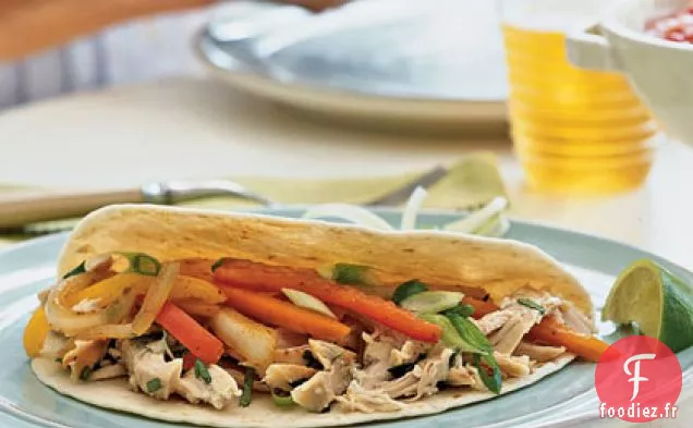 Arroser la vinaigrette sur le poulet; mélanger pour enrober. Disposer le poulet, les légumes et les tortillas chaudes sur un plateau.
