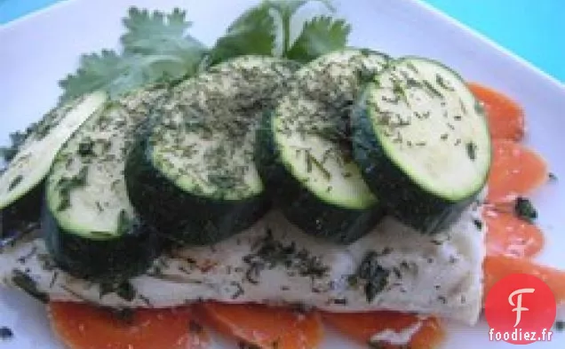 Placer les tranches de courgettes sur chaque filet de flétan.