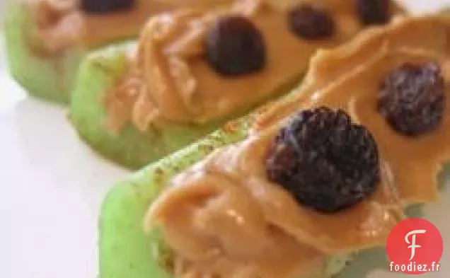 Placez les morceaux de céleri sur une surface propre, partie creuse vers le haut, et saupoudrez uniformément de cannelle. Verser le beurre d'arachide dans le creux et disposer les raisins secs sur le dessus.