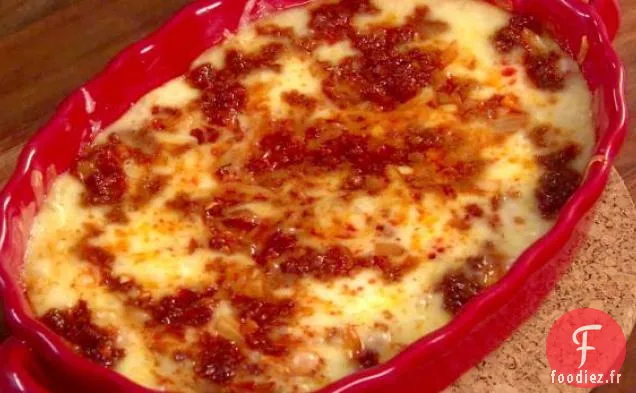Mettez 1/2 de fromage dans le plat allant au four et saupoudrez de 1/2 du mélange de chorizo. Répéter avec le reste du mélange de fromage et de chorizo.