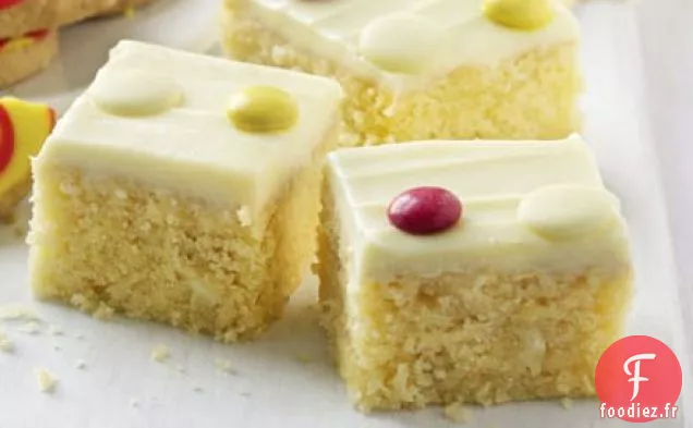 Faire fondre le reste du chocolat. Incorporer le sucre glace dans le fromage à pâte molle, puis le chocolat jusqu'à consistance lisse. Refroidir, étaler sur le gâteau, puis couper en carrés et décorer.
