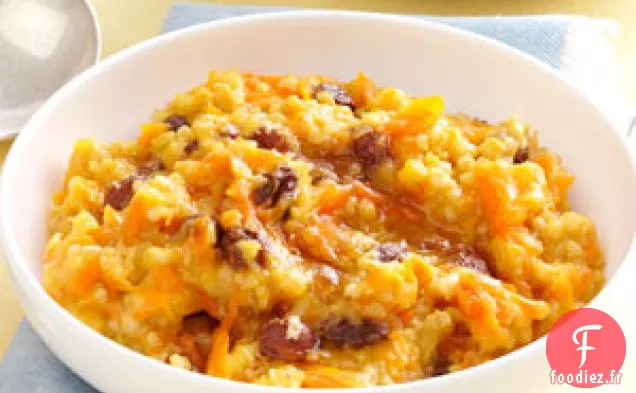 Le gruau au gâteau aux carottes est un petit-déjeuner qui sert 8 personnes. Une portion de ce plat contient environ 4 g de protéines , 2 g de matières grasses et un total de 219 calories . Pour 64 cents par portion , cette recette couvre 9 % de vos besoins quotidiens en vitamines et minéraux. Elle vous est proposée par Taste of Home. Un mélange d'eau, de cassonade, de raisins secs et d'une poignée d'autres ingrédients suffit à rendre cette recette si délicieuse. Elle est parfaite pour Pâques . 1 personne a été impressionnée par cette recette. De la préparation à l'assiette, cette recette prend environ 6 heures et 10 minutes . C'est une bonne option si vous suivez un régime sans gluten, sans produits laitiers, lacto ovo végétarien et végétalien . Avec un score de 63% , ce plat est bon. Des recettes similaires sont Gâteau aux épices aux carottes et aux raisins secs à l'ananas , Meilleur gâteau aux carottes avec glaçage au fromage à la crème et Muffins au gâteau aux carottes à la compote de pommes .