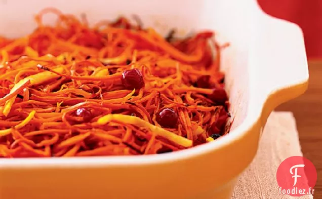 Beurrez un plat allant au four en verre carré de 9 pouces. Dans un bol moyen, mélanger les carottes, la pomme, les canneberges, le jus de pomme et le miel. Emballez le mélange dans le plat en lissant la surface.