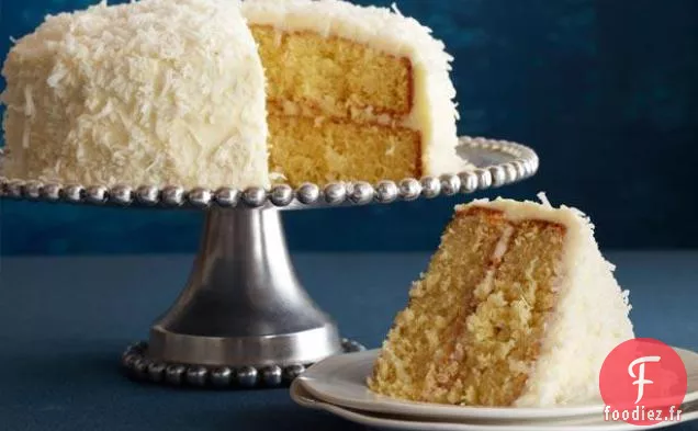 Placez la deuxième couche sur le dessus, le dessus vers le haut et givrez le dessus et les côtés. Pour décorer le gâteau, saupoudrez le dessus de noix de coco et appuyez légèrement plus de noix de coco sur les côtés.