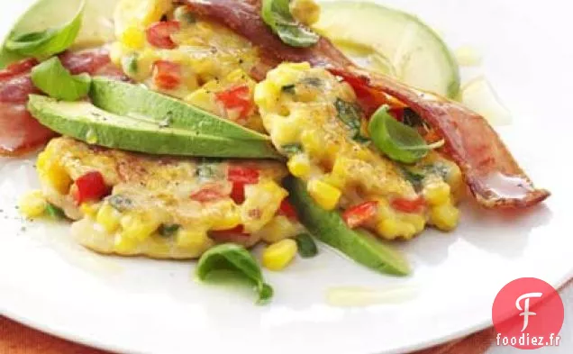 Gâteaux de maïs chauds à l'avocat, au bacon et au basilic