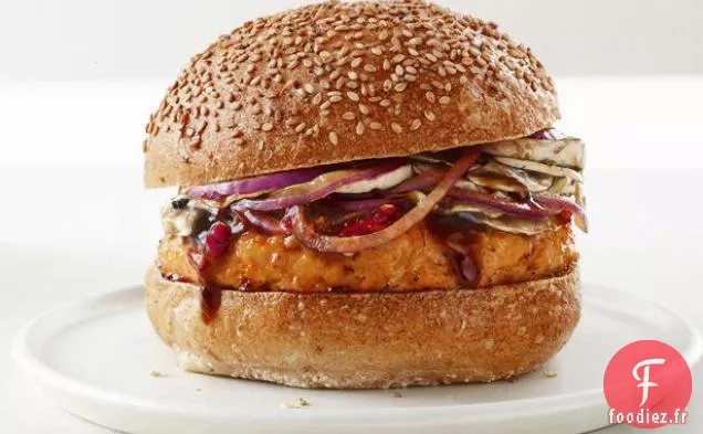 Servir les hamburgers sur les petits pains avec un filet de sauce hoisin-sambal et un peu du mélange de champignons.