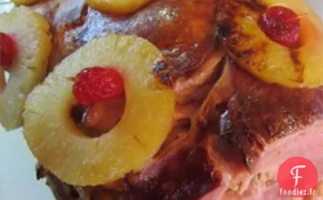 Versez le soda au gingembre dans la rôtissoire. Frottez la cassonade sur le jambon. Fixez les tranches d'ananas à l'extérieur du jambon avec des cure-dents. Fixez à nouveau une cerise au milieu de chaque tranche d'ananas à l'aide de cure-dents.