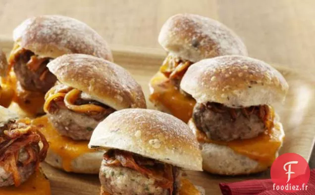 Déposer une tranche de fromage sur la moitié inférieure de chaque rouleau; garnir d'un hamburger, d'oignons caramélisés et du rouleau.