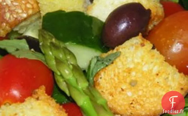 Mélanger les asperges, le concombre, les tomates cerises, les tomates jaunes, l'oignon rouge, les olives, les câpres, les boules de mozzarella et les cubes de pain dans un grand bol.
