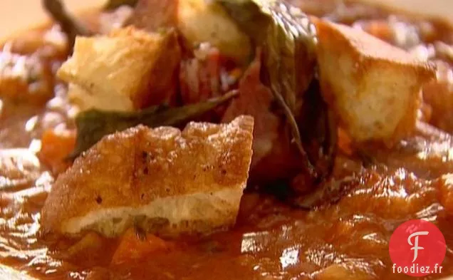 Arroser d'huile d'olive, saupoudrer de sel et de poivre et bien mélanger. Cuire, en remuant de temps en temps, de 20 à 25 minutes, jusqu'à ce que tous les ingrédients soient croustillants. Les feuilles de basilic deviendront sombres et croquantes, ce qui est parfaitement fin. Réchauffez la soupe, si nécessaire, battez avec un fouet jusqu'à ce que le pain soit brisé. Incorporer le parmesan et le goût pour l'assaisonnement.