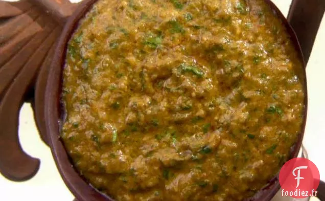 Ajouter le parmesan, la coriandre, l'ail, la poudre de chili et l'huile et mélanger jusqu'à ce que le tout soit bien mélangé, mais pas totalement lisse. Goûter et assaisonner de sel.;