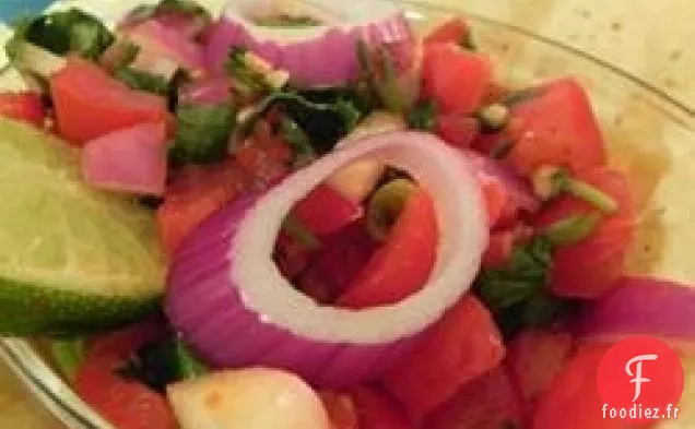 Placez les tomates, l'oignon rouge, la coriandre, le piment jalapeno, le sel, le poivre noir, l'ail et le jus de citron vert dans un grand bol à mélanger.