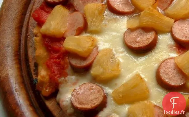 Égoutter l'ananas et le couper en petits morceaux.Une fois la pizza levée, étalez la tomate partout, puis ajoutez le fromage, la saucisse et l'ananas.