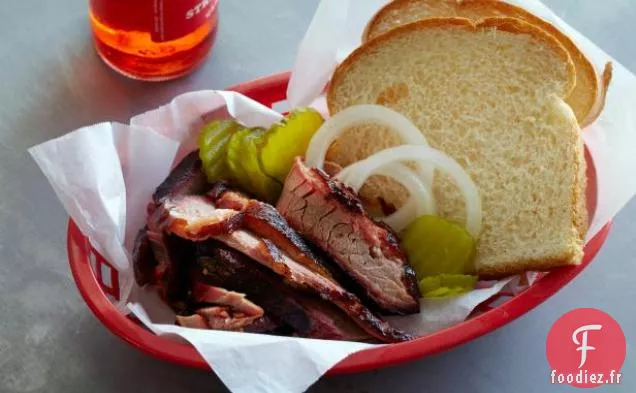 Lorsque la poitrine atteint une température interne de 165 à 170 degrés F sur un thermomètre à viande à lecture instantanée (après environ 4 à 5 heures), retirez-la du gril et enveloppez-la deux fois dans du papier d'aluminium pour éviter que le jus ne s'échappe. Remettre la poitrine sur le gril (ou le fumoir) La poitrine est terminée lorsqu'elle est très tendre et atteint une température interne de 190 degrés F, soit environ 1 à 2 heures supplémentaires.