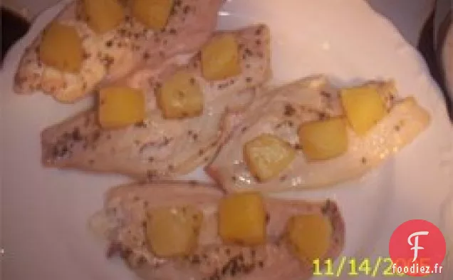 Versez le jus de citron sur les filets et saupoudrez de thym et de basilic. Garnir chaque filet d'ananas.
