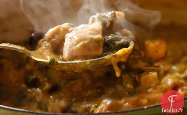 Ajouter le mélange poulet-oignon réservé, les tomatillos, le bouillon de poulet, les pommes de terre, l'origan et le bâton de cannelle dans la casserole et mélanger. Porter à ébullition à feu vif, puis réduire le feu à feu moyen-doux et laisser mijoter, en remuant de temps en temps, jusqu'à ce que le mélange épaississe et que les pommes de terre soient tendres, environ 1 1/2 heure.Incorporer la coriandre, goûter et assaisonner de sel au besoin.Accords boissons: Avec sa combinaison de légumes terreux et d'épices affirmées, ce plat appelle quelque chose d'un peu exotique comme le FMC 2005, un Chenin Blanc hors sec du maître du raisin sud-africain Ken Forrester. Complexe avec des herbes, de la terre, des fruits et du pain grillé, le vin légèrement boisé est une touche sucrée, qui apaisera tout piquant du chili vert.