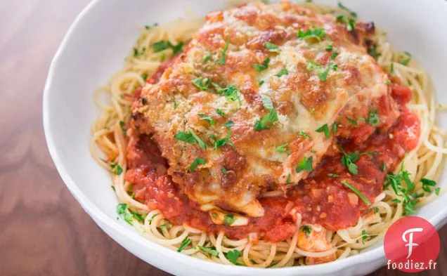 Servir le poulet Parmesan sur un lit de spaghettis avec une pincée de persil pour la garniture.