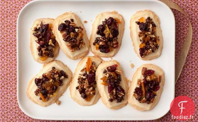 Après 20 minutes, retirez les biscuits du four et étalez la garniture aux fruits et aux noix sur le dessus du sablé. Remettre au four pendant 7 à 8 minutes de plus. Laisser refroidir avant de servir. Mieux mangé dans un jour ou deux de fabrication.