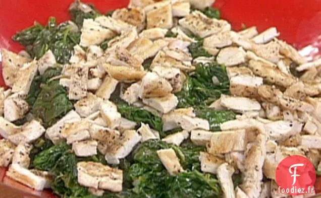 Faire revenir 5 minutes puis ajouter le vin blanc et réduire de 30 secondes. Ensuite, ajoutez le jus de 1 citron et ajoutez immédiatement le monticule d'épinards dans la poêle. Vous ne pourrez pas tout intégrer là-dedans. Continuez à tourner les épinards et à les flétrir jusqu'à ce que vous obteniez tout là-dedans, puis éteignez le feu. Gardez quelques feuilles encore un peu croquantes pour varier les textures de votre salade. Assaisonner les épinards de sel et de poivre. Hacher le poulet en petits morceaux et ajouter à la salade tiède. Mélanger pour distribuer et servir.