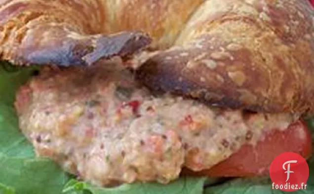 Dans un robot culinaire, mélanger le thon, le poivron rouge, l'oignon, la coriandre, les câpres, la relish, la mayonnaise, la moutarde et la poudre d'ail jusqu'à consistance lisse.