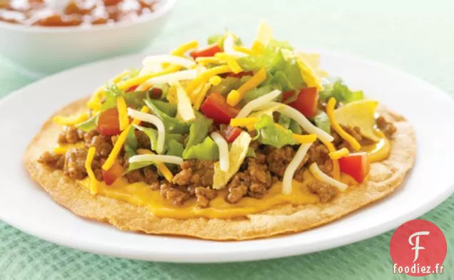 Étalez chaque tortilla avec 1 cuillère à soupe. Sauce au fromage Nacho; garnir du mélange de viande et de laitue. Émietter 1 coquille de taco sur chaque tostada; garnir de tomate, de fromage et de salsa.