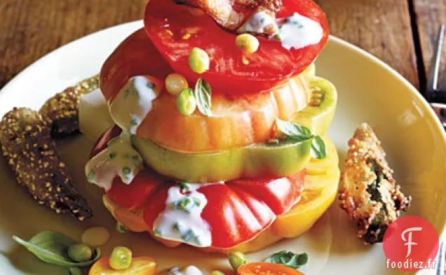 Répartir uniformément les tranches de tomates dans 6 assiettes; garnir uniformément chaque portion de tomates cerises. Déposer 2 cuillères à soupe de pois sur chaque pile de tomates. Disposer 5 morceaux de gombo frit sur chaque portion; saupoudrer uniformément de bacon.