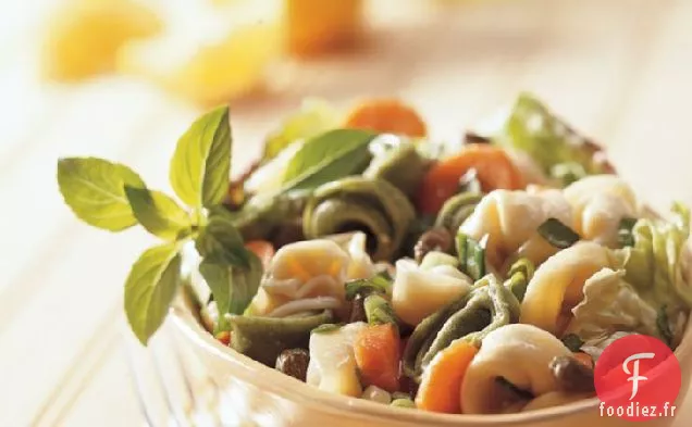 Secouez tous les ingrédients de la vinaigrette au basilic et aux câpres dans un récipient bien recouvert. Dans un grand bol en verre ou en plastique, placer les tortellinis et tous les ingrédients restants de la salade de Tortellinis.