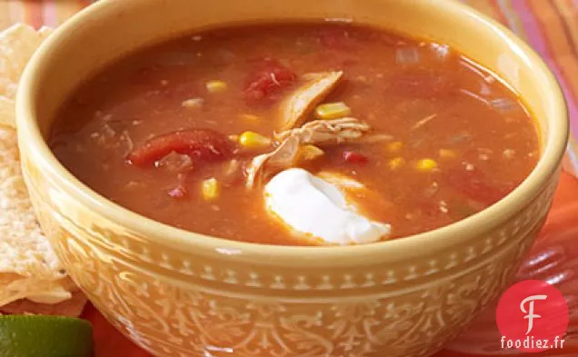 Ajouter l'oignon et l'ail; faire revenir 2 minutes. Incorporer le poulet et les 9 ingrédients suivants (poulet dans la soupe aux tomates); porter à ébullition. Réduire le feu et laisser mijoter 1 heure. Verser la soupe dans des bols; garnir de chips de tortilla et de crème sure.