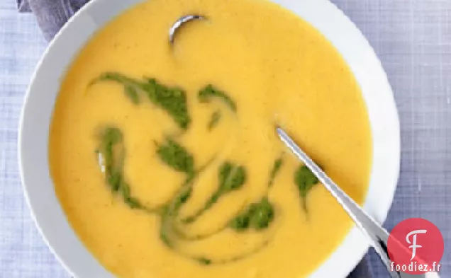 Arroser un peu de purée de légumes verts sur la soupe et servir.