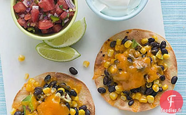 Pendant que les tortillas sont grillées, mélanger les haricots, le maïs, l'avocat, la coriandre, l'huile d'olive, le jus de citron vert et les flocons de poivron rouge dans un grand bol. Garnir les tortillas, toujours sur une plaque à pâtisserie, d'un mélange de haricots et de maïs.