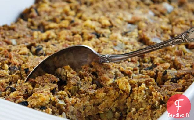 Verser dans la casserole préparée et cuire au four pendant 20 à 30 minutes. Quand une lame de couteau sort propre, c'est fait. Réserver pour refroidir. (Vous pouvez le faire un jour ou deux à l'avance.) Une fois le pain de maïs frais, émiettez-le dans un très grand bol. Il n'a pas besoin d'être complètement décomposé en miettes, mais il devrait y avoir quelques morceaux de plus de 1/2 pouce. Déchirez le pain de grains entiers en petits morceaux (vous pouvez le faire en deux lots dans le robot culinaire, si vous le souhaitez) et ajoutez-le au pain de maïs.