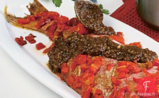 Transférer le poisson cuit dans un plat de service chauffé et enrober le poisson de la sauce.